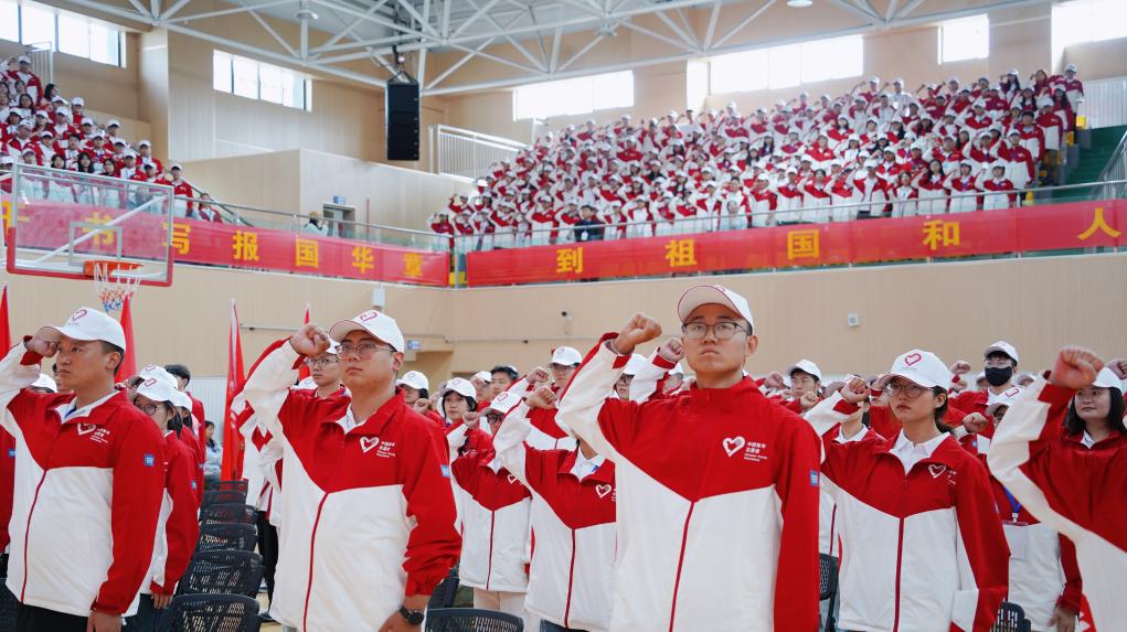 7月29日,2025年大學(xué)生志愿服務(wù)西部計(jì)劃服務(wù)西藏專項(xiàng)志愿者出征儀式上,志愿者們正在宣誓。陳梟 攝