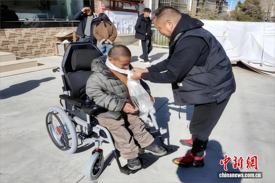 扎西平措為巴熱村殘障人士發(fā)放輔助設(shè)備。 受訪者供圖