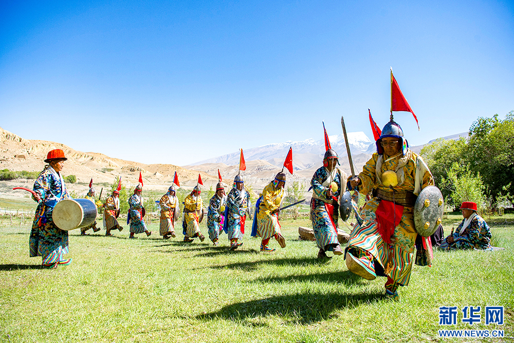 札達(dá)縣群眾在古格王國遺址腳下表演“宣舞”(6月12日攝)?!靶琛笔俏鞑匕⒗锩耖g傳統(tǒng)舞蹈,融合藏戲、舞蹈、說唱等傳統(tǒng)民間藝術(shù),內(nèi)容涵蓋禮儀、風(fēng)俗、節(jié)慶等。2008年,被列入國家級非物質(zhì)文化遺產(chǎn)名錄。新華網(wǎng) 旦增努布 攝