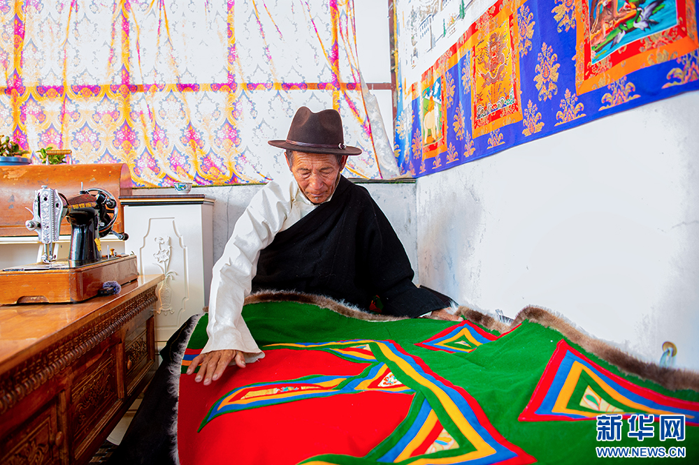 “噶爾傳統(tǒng)服飾”地區(qū)級代表性傳承人石達(dá)次仁在介紹自治區(qū)級非物質(zhì)文化遺產(chǎn)“噶爾傳統(tǒng)服飾”(6月14日攝)。“噶爾傳統(tǒng)服飾”由羊羔皮和呢子內(nèi)外兩面縫制而成,形狀為正方形,制作簡易,內(nèi)里均為純白色的羊羔皮,羊羔皮既保暖又有裝飾性。新華網(wǎng) 旦增努布 攝