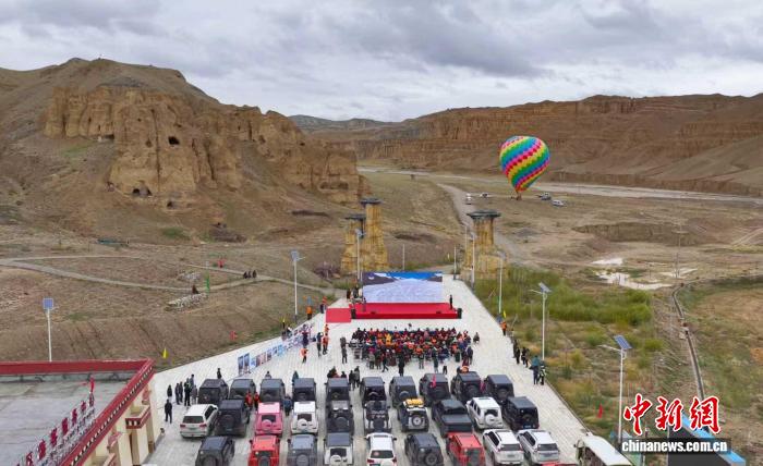 9月1日,參加“天上阿里·云巔自駕”活動的游客在札達(dá)縣霞義溝土林景區(qū)參加開幕式(無人機(jī)照片)。閆志國 攝