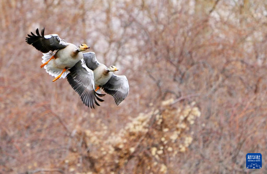 斑頭雁在拉魯濕地上空飛翔(3月8日攝)。新華社記者 張汝鋒 攝