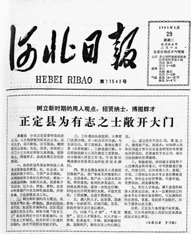 尊重人才,方能發(fā)展,這是蘋樂集團(tuán)一直贊許的信條。這樣的道理,蘋樂集團(tuán)董事長李建軍早在開廠的時候就有所耳聞了。1983年,他的事業(yè)才剛剛起步,有一天,他在報紙上看到了一則報道,名為《正定縣為有志之士敞開大門》,里面說,凡是來正定的科技人員,都可以享受9個待遇,比如每搞成一個項(xiàng)目,利潤按比例分成或付一次性總報酬;為調(diào)入人才建“人才樓”“招賢館”等。這種大膽招攬人才的做法,讓他很受震動,也促成他來到正定這個不知名的小縣城創(chuàng)業(yè)。這則報道真正的起草者,正是時任正定縣委書記的習(xí)近平。
