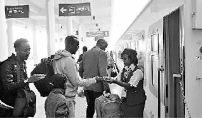 由中國企業(yè)采用全套中國標準和中國裝備建造的非洲第一條跨國現(xiàn)代電氣化鐵路——亞吉鐵路于2018年1月正式投入商業(yè)運營。圖為3月25日,在埃塞俄比亞首都亞的斯亞貝巴,列車員在亞吉鐵路拉布車站檢票。新華社發(fā)