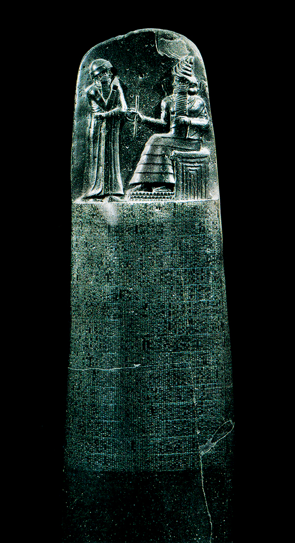 《漢穆拉比法典》是古代兩河流域文明的象征。這座在公元前18世紀建造的玄武巖石碑,上端有漢穆拉比從太陽神沙馬什手中接受權杖的浮雕像,下面用楔形文字銘刻法典全文。法典除序言和結(jié)語外,計有3500行、282條,包括訴訟手續(xù),財產(chǎn)權,損害賠償,租佃關系,債權債務,婚姻家庭,繼承以及買賣奴隸等內(nèi)容,是迄今世界上完整保存下來的最早的一部法典。圖為現(xiàn)藏于法國巴黎盧浮宮的《漢穆拉比法典》。