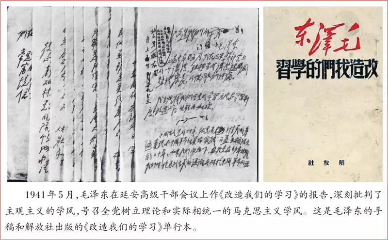 延安整風(fēng)運(yùn)動(dòng)以反對(duì)主觀(guān)主義、宗派主義、黨八股,樹(shù)立馬克思主義作風(fēng)為主要內(nèi)容。而鑒于深重的思想之弊和慘痛的實(shí)踐教訓(xùn),反對(duì)主觀(guān)主義以整頓學(xué)風(fēng),成為開(kāi)展整風(fēng)運(yùn)動(dòng)的關(guān)鍵。整風(fēng)運(yùn)動(dòng)開(kāi)展后,毛澤東就緊緊抓住思想方法和作風(fēng)問(wèn)題不放。他在給中央研究組同志的信中指出:學(xué)習(xí)理論要“以研究思想方法論為主”。破除錯(cuò)誤的思想方法,暢行正確的思想作風(fēng),最重要的就是要遵循實(shí)事求是的思想路線(xiàn),做到理論聯(lián)系實(shí)際?!皩?shí)事求是”這個(gè)詞,并非毛澤東首創(chuàng),但把“實(shí)事求是”上升到黨的思想路線(xiàn)的高度,則是毛澤東的功勞。毛澤東強(qiáng)調(diào),“要分清創(chuàng)造性的馬克思主義和教條式的馬克思主義”,“宣傳創(chuàng)造性的馬克思主義”,“使中國(guó)革命豐富的實(shí)際馬克思主義化”。不能從理論上來(lái)思考中國(guó)革命實(shí)踐的人,是不能妄稱(chēng)為馬克思主義理論家的。只有從客觀(guān)實(shí)際中概括出而又在客觀(guān)實(shí)際中得到證明的理論,才稱(chēng)得起我們所講的理論。