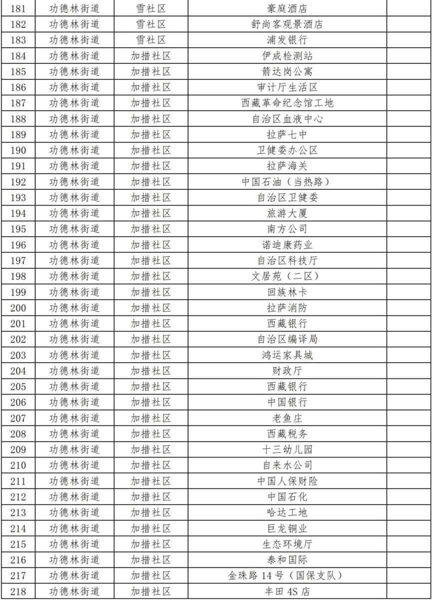 17.功德林街道加措社區(qū)(伊成檢測站、箭達(dá)崗公寓、審計(jì)廳生活區(qū)、西藏革命紀(jì)念館工地、自治區(qū)血液中心、拉薩七中、衛(wèi)健委辦公區(qū)、拉薩海關(guān)、中國石油(當(dāng)熱路)、自治區(qū)衛(wèi)健委、旅游大廈、南方公司、諾迪康藥業(yè)、自治區(qū)科技廳、文居苑(二區(qū))、回族林卡、拉薩消防、西藏銀行、自治區(qū)編譯局、鴻運(yùn)家具城、財(cái)政廳、西藏銀行、中國銀行、老魚莊、西藏稅務(wù)、十三幼兒園、自來水公司、中國人保財(cái)險(xiǎn)、中國石化、哈達(dá)工地、巨龍銅業(yè)、生態(tài)環(huán)境廳、泰和國際、金珠路14號(hào)(國保支隊(duì))、豐田4S店、110便民支隊(duì)、第三安居苑、財(cái)經(jīng)學(xué)院、農(nóng)銀大學(xué)、圣州加氣站、錦江之星酒店、自治區(qū)衛(wèi)校、拉薩市農(nóng)行退休基地、財(cái)康青年旅社、甘丹寺招待所、西藏自治區(qū)疾控中心第二工作區(qū)、拉薩市運(yùn)管局、尼泊爾領(lǐng)事館、加措社區(qū)居委會(huì)、金陵酒店、澤當(dāng)飯店、環(huán)球大廈、區(qū)工人療養(yǎng)院、交警總隊(duì)、銀都賓館);