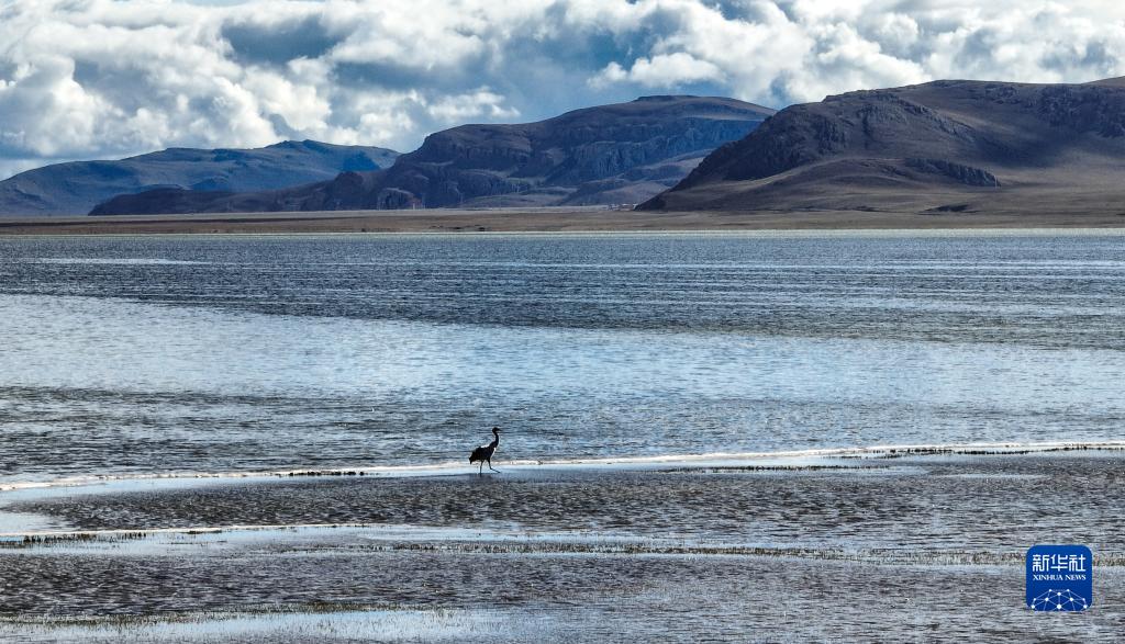 9月16日在多慶湖邊拍攝的黑頸鶴(無人機(jī)照片)。新華社記者 晉美多吉 攝