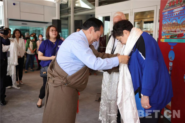 活動中,班覺才仁會長為鄧先生獻上哈達,祝福這次展出圓滿成功!