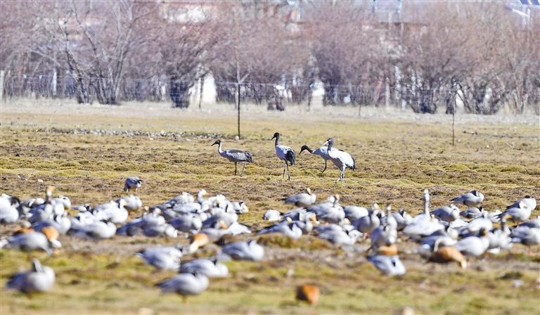 隨著節(jié)氣轉(zhuǎn)換、氣候變冷,拉薩市林周縣境內(nèi)迎來了大批飛抵越冬的黑頸鶴,它們將在這里一直待到來年的三四月份。