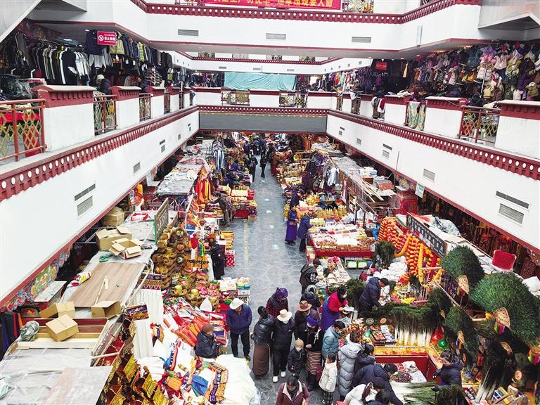 “八廓商城將年貨商家集中在一起,商戶們無需再風(fēng)吹日曬,還能免費(fèi)使用攤位?!睆?qiáng)巴次仁說,“為了保障商場內(nèi)的衛(wèi)生和安全,保潔人員定時打掃衛(wèi)生,工作人員定時巡邏,全面排查各類安全隱患,既方便了商戶,也方便了老百姓?!蔽?圖 記者 張雪芳