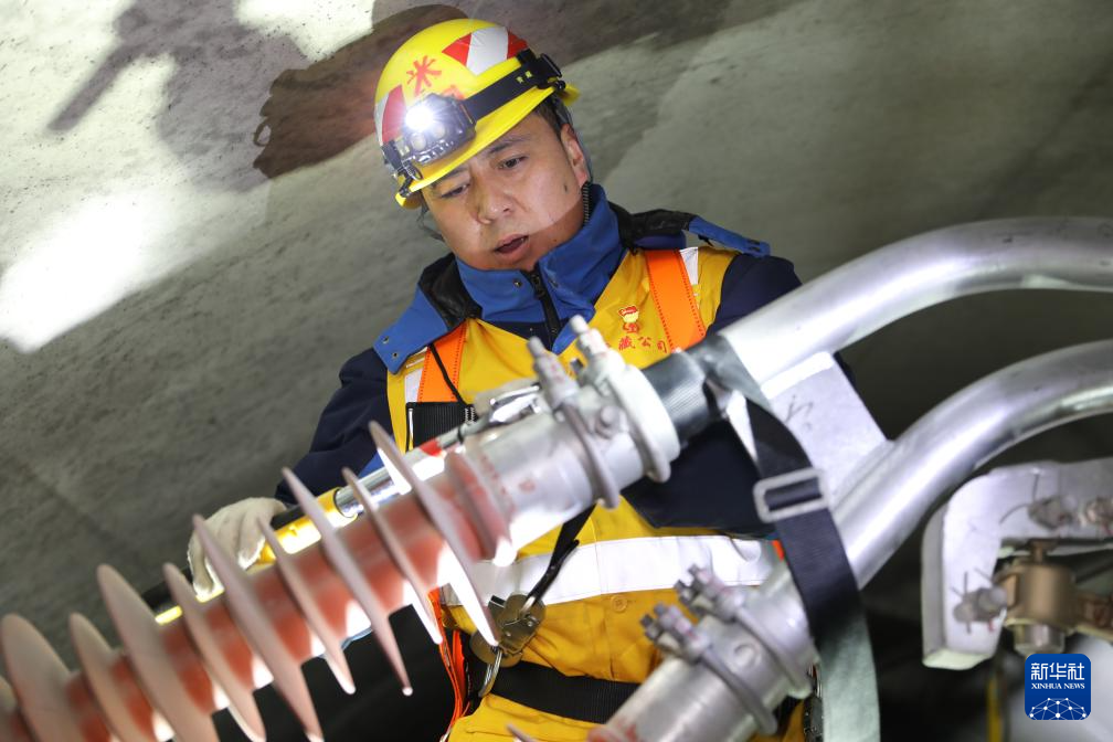 春運(yùn)期間,接觸網(wǎng)工人劉海軍在拉林鐵路色拉丘隧道內(nèi)為接觸網(wǎng)更換絕緣子。(拉巴次仁攝)