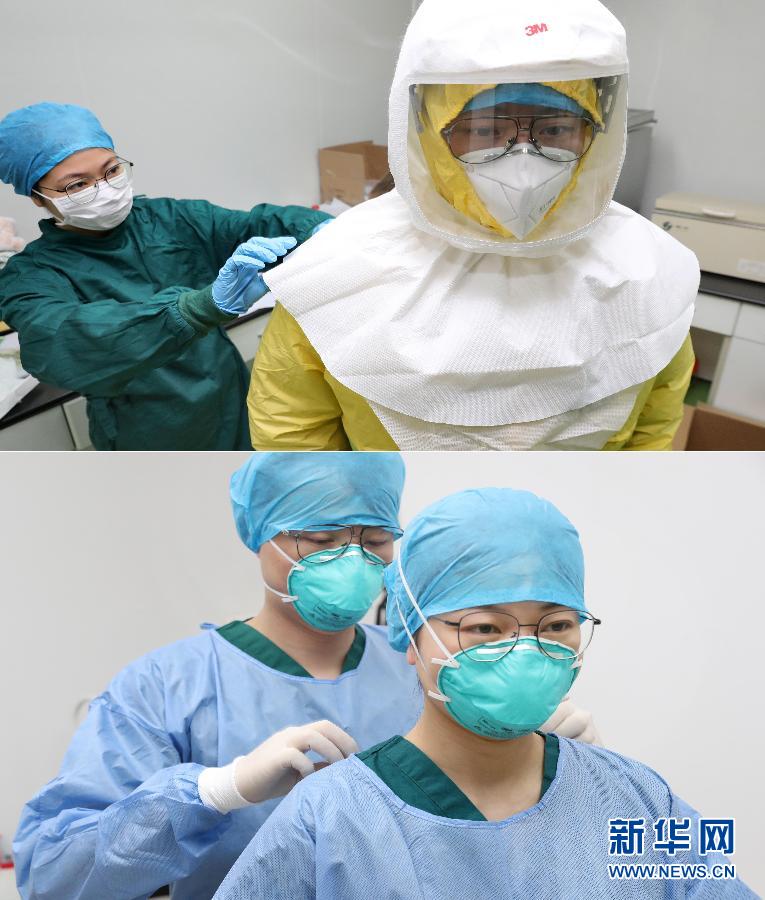 這張拼版照片顯示的是:2月25日,江蘇省南通市疾控中心病原微生物實驗室的檢測人員郭陳(左)在清潔區(qū)幫助丈夫季霄雷穿防護服、戴正壓面罩(上);4月26日,季霄雷(左)幫助郭陳穿防護服(下)?!拔逡弧鼻跋?,江蘇省南通市疾控中心病原微生物實驗室檢測組的90后黨員季霄雷和妻子郭陳以及其他同事依然堅守在疫情防控第一線。 新華社發(fā)(許叢軍 攝)